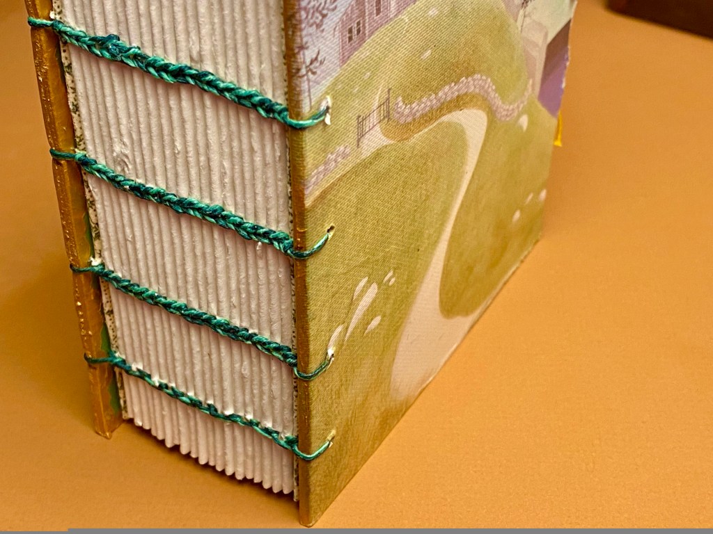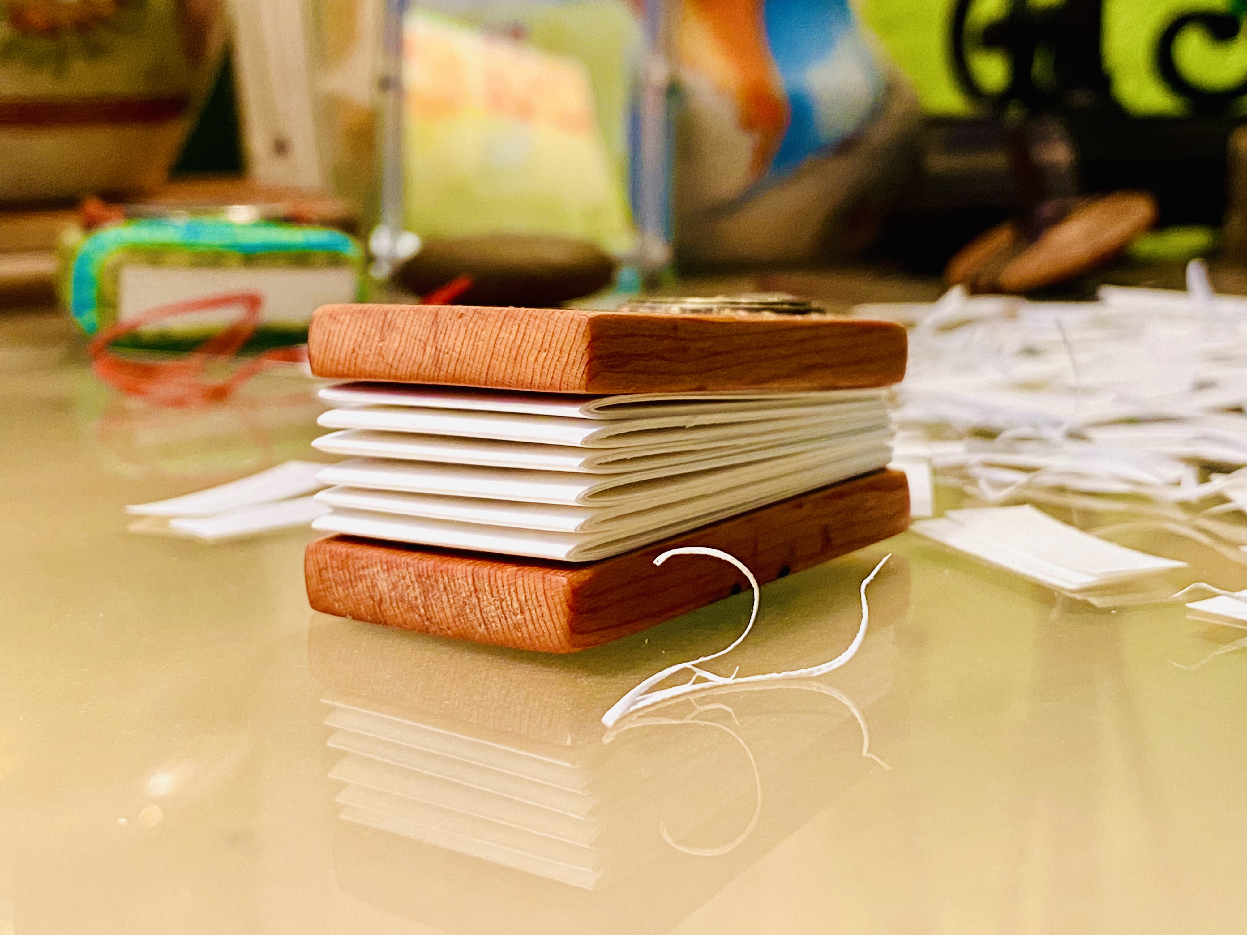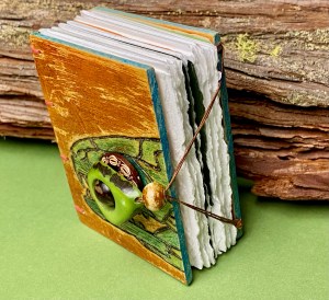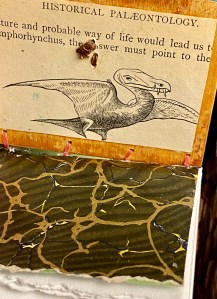 “Paleontology” is a Miniature Hand Bound Journal with wood covers and a Coptic open stitch binding. Material: Wood, thread, button, tagua nut beads, upcycled vintage illustrations on inside covers, decorative divider papers, blank paper.