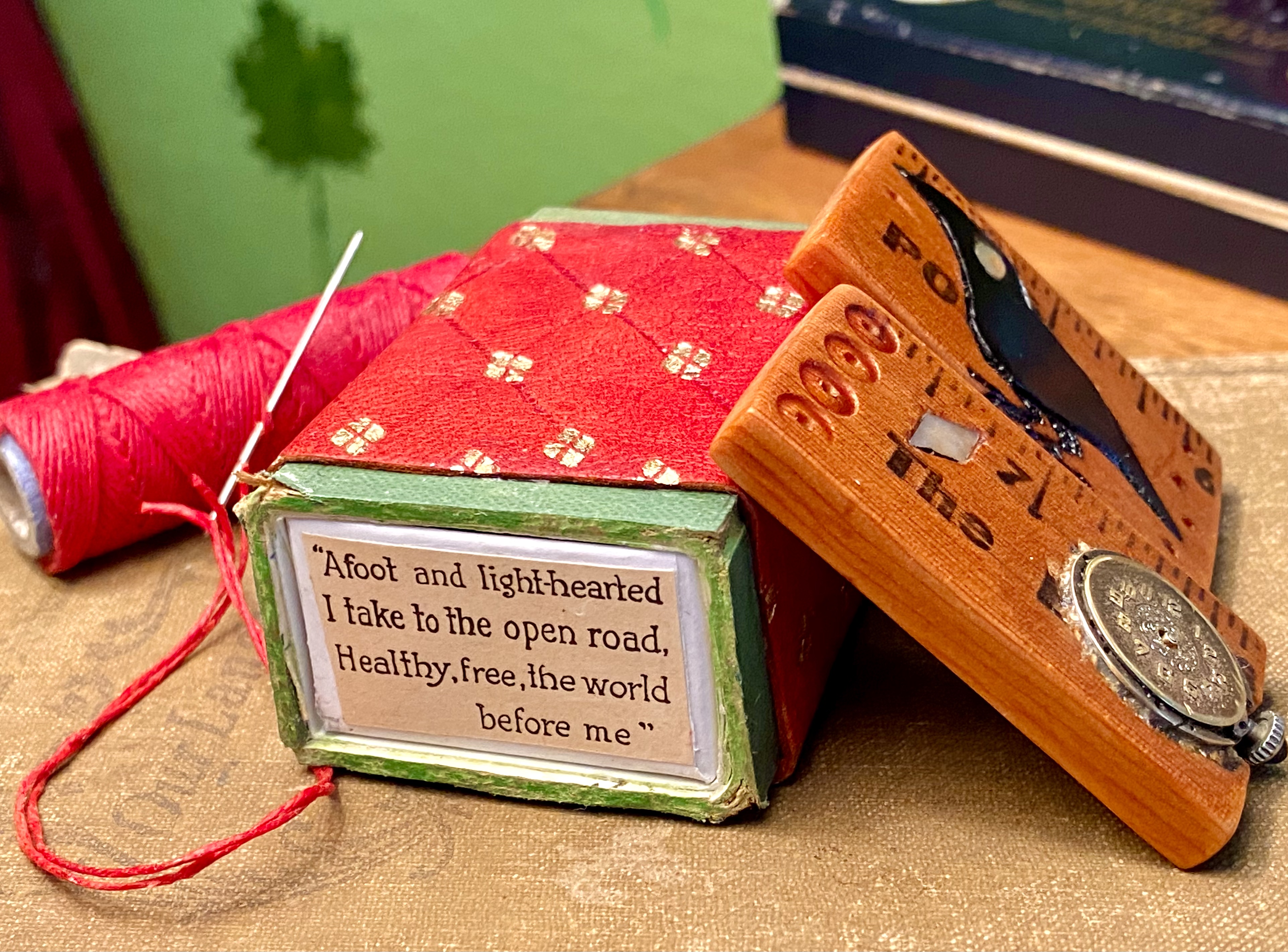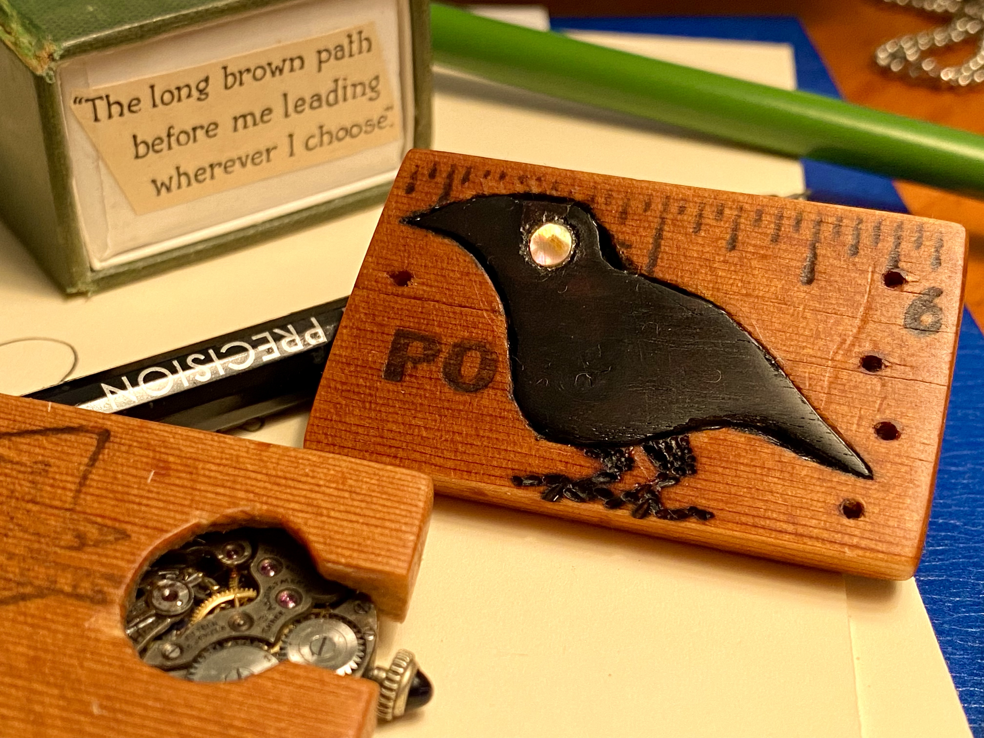 Item Details: Miniature book about the size of a small matchbox, book cover is made from an old wood ruler, clock parts, crow hand-carved from ebony wood, and ephemera.