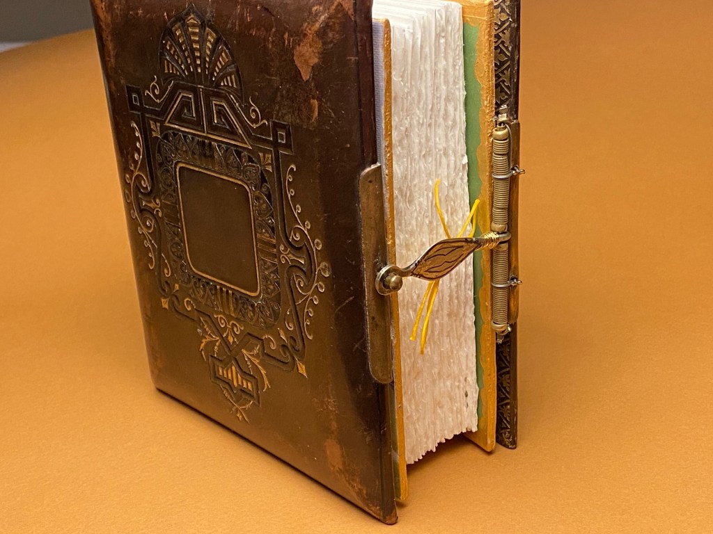 This is an 1880 leather album which I refurbished, strengthened the spine and rebuilt the clasp. I then made a handmade book of watercolor paper bound with a Coptic stitch, that then pressure fit inside the leather album. I learned a lot in working on this project. Personal collection of Christopher Johnson.