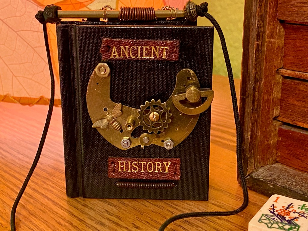 History, a record of humanity, daily disappearing into minute particles in this digital era. In the words of Octavio Paz, “Tomorrow, we shall have to invent, once more, the reality of this world.” I upcycled this small 2.5 by 3 inch book into a wearable book, using clock parts, words from a vintage leather book spine, brass hardware, beads and a nice little rusty spring.