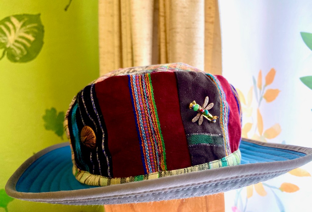 I wanted a handy summer hat to wear to block out the sun, and had just a fabric pillbox hat without a rim, and a rain hat in need of personality. So I combined the two hats! For embellishment, I added a vintage brass button and a dragonfly pin I had made on one side, and on the other side I added a vintage floral clip earring.